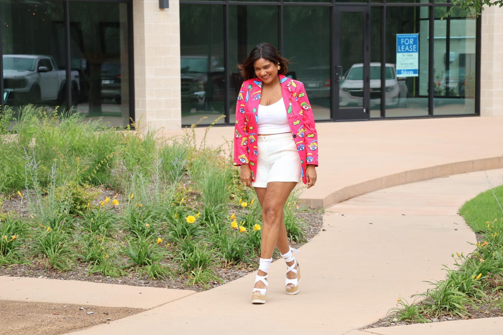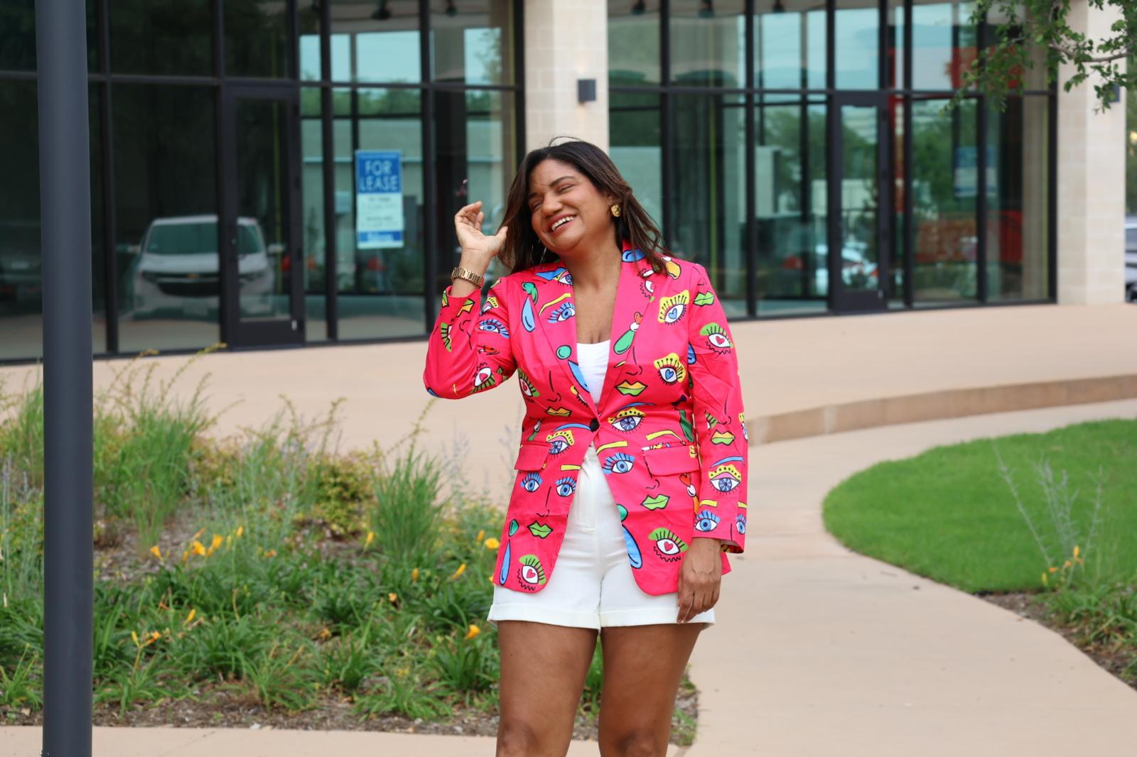 Con un fondo fucsia vibrante y estampados de ojos y labios estilo pop-art, este blazer es el protagonista de cualquier outfit. Su corte estructurado favorece la figura y su tela ligera lo hace cómodo para usar en cualquier temporada.